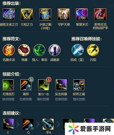 R技能:宗师之威,大招的被动技能每三次普攻就会造成额外的魔法伤害。主动施放会增加双抗,使得武器大师在后期可以不过多依赖防御装备。