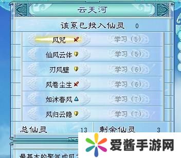 由于属性点是固定的,而且仙术加点不可逆,越到后期等级越慢仙灵点越难获得,基本上前期加点决定之后该怎么玩。加点时,应以性价比和高阶技能为主,确保天河能够全面发展,既有一定的生存能力,又有足够的输出。