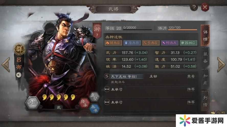 培养建议:重点培养吕布的攻击、特技、移动等属性,装备方天画戟、锁子连环甲等高级武器和防具,以提升其战斗力。