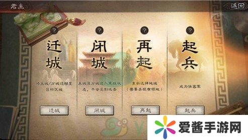 在君主选项中,可以看到对城池的操作选项,分别是“迁城”、“闭城”和“再起”。点击“迁城”并选择目标区域即可完成迁城操作。