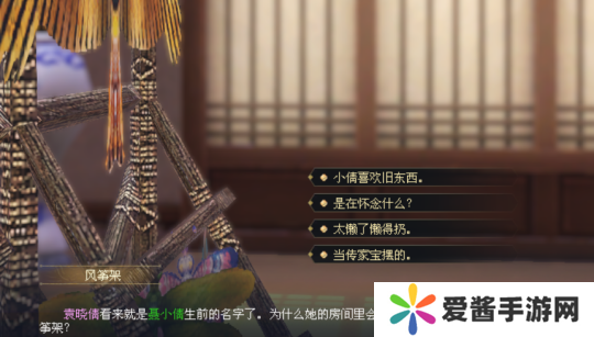 房间的秘密:与果儿对话领取任务,传送至袁晓倩闺房,与风筝架(82,64)对话选择答案(是在怀念什么—袁崇焕将军做的—代表羁绊),找到信匣(63,65或63,66)领取任务。