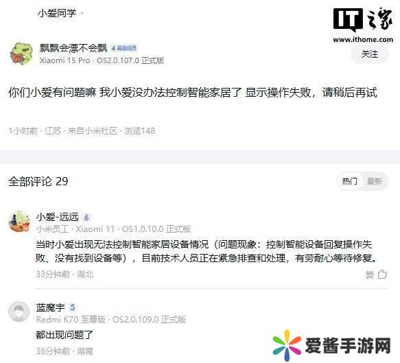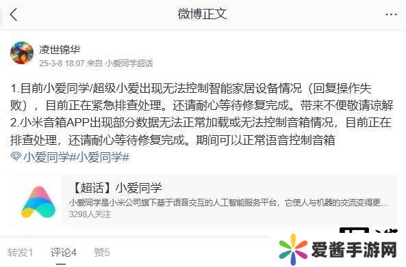 小米社区的知名用户@凌世锦华也对此事发表了看法。他表示,目前小爱同学以及超级小爱确实存在无法控制智能家居设备的情况,用户在尝试操作时系统会回复“操作失败”。同时,他还提到小米音箱App也出现了部分数据无法正常加载或无法控制音箱的问题。不过,他也安抚用户称,这些问题都在紧急排查处理中,并且在此期间,用户仍然可以通过语音正常控制音箱。