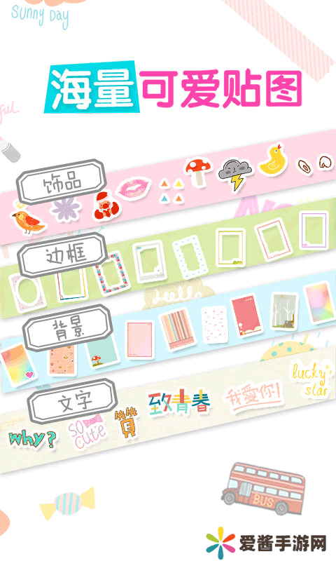 3、全新整理的可爱拼图风格,做到了用“文字 ”萌动心情,随时分享你的美图日记。