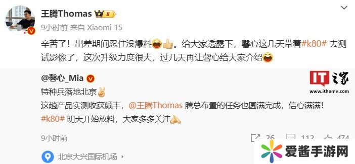 另外,王腾还透露 Redmi 产品经理胡馨心近日正对 Redmi K80 系列手机进行影像测试,新系列手机将在今日开始“放料”。