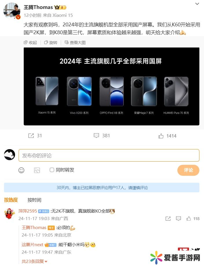 本站 11 月 18 日消息,小米中国区市场部副总经理、Redmi 品牌总经理王腾昨日发文称,Redmi 从 K60 开始采用国产 2K 屏,到 K80 是第三代。这表明 K80 系列新机将采用国产 2K 屏,结合爆料来看,预计为 2K 华星 LTPS 直屏。
