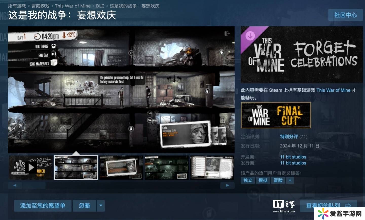 游戏开发商11 Bit Studios近日为备受瞩目的游戏《这是我的战争》增添了一份新的惊喜,正式推出了名为“妄想欢庆”的DLC内容,定价亲民,仅为15元人民币。该DLC现已登陆Steam平台,并伴随着一项特别的公益活动:所有通过DLC获得的收益都将捐赠给官方周年庆活动中的慈善合作伙伴。