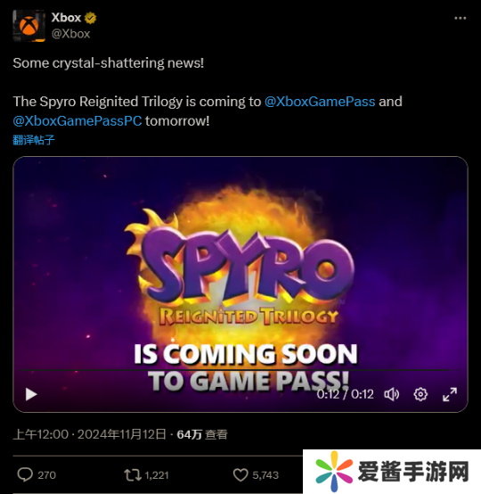 早些时候,微软游戏订阅服务 Xbox Game Pass 官方发布了一条短视频,展示了一个《小龙斯派罗》游戏中的箱子。在随后多次暗示之后,官方正式宣布,《小龙斯派罗:重燃三部曲》将于“明天”登陆 XGP 服务,供订阅用户游玩。