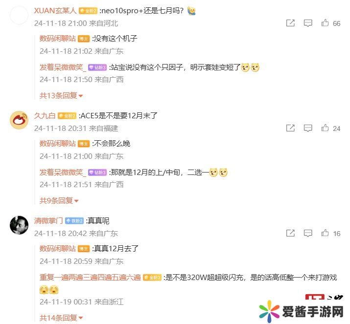 博主还在评论区中回复了部分网友问题:针对 iQOO Neo10S Pro+ 机型是否在 7 月(此处预计指明年)发布,博主称“没有这个机子”;针对一加 Ace 5 系列手机是否在 12 月末发布,博主回复“不会那么晚”;针对 realme 真我新机发布时间,博主表示“真真 12 月去了”。