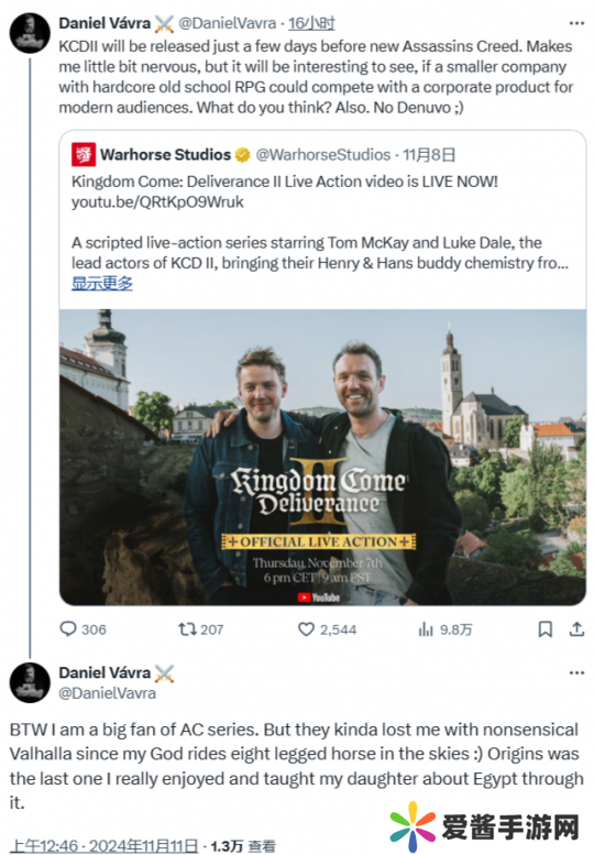 Daniel Vavra在社媒上表示《天国:拯救2》在《刺客信条:影》前几天发售让他有点紧张,不过他很高兴看到他们的老式硬核RPG与拥有现代用户的企业级产品一较高下。