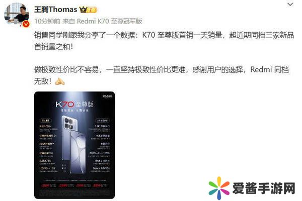 K70至尊版的销售成绩也验证了其强大的市场竞争力。据官方数据显示,该机在首销3小时内就打破了2024年的首销纪录,并且在全网全价位段都取得了首销量第一的好成绩。红米品牌总经理王腾也分享了相关数据,K70至尊版首销一天的销量超过了近期同价位段三家新品首销量的总和。