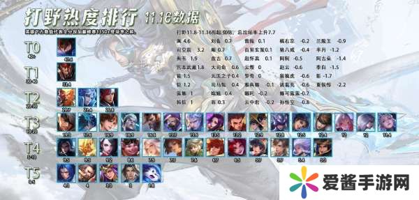 这周没有打野位置的相关调整,也没有新皮肤,所以大部分的英雄出场率是没有变化的。有变化的大多都是因为玩家们感知到了这个英雄在这个版本较强或者是较弱,所以更多的玩家加入或者是离开。
