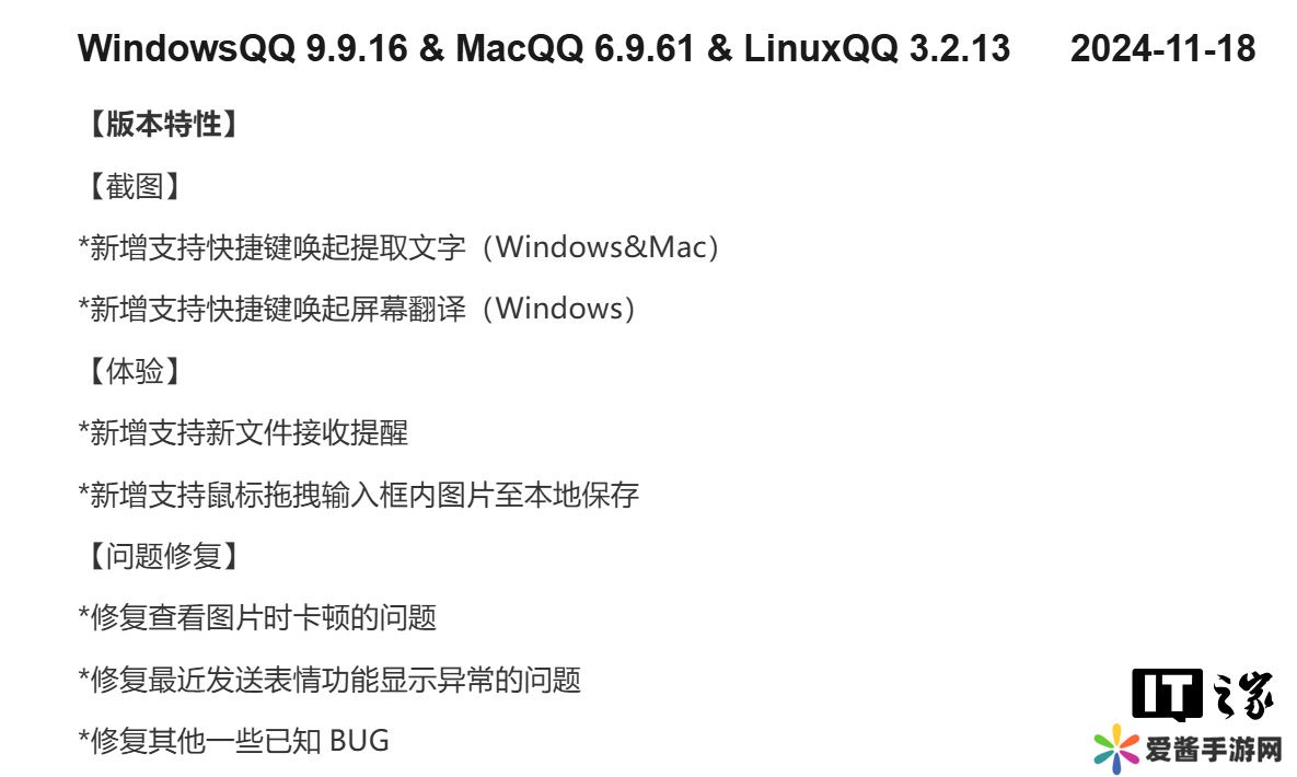 本站 11 月 18 日消息,腾讯 QQ 今日(11 月 18 日)更新 Windows 9.9.16、macOS 6.9.61、Linux 3.2.13,新增支持快捷键唤醒提取文字等功能。