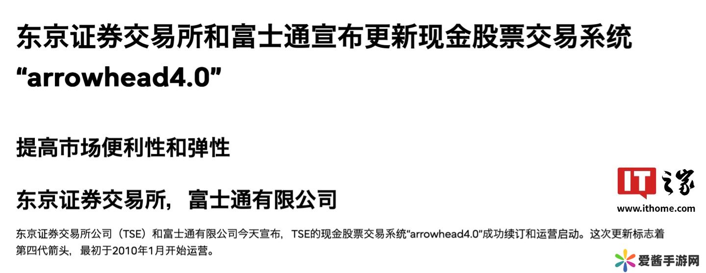 本站 11 月 18 日消息,日本交易所集团宣布,东京证券交易所联合富士通于 11 月 5 日上线了新一代交易系统 Arrowhead 4.0。