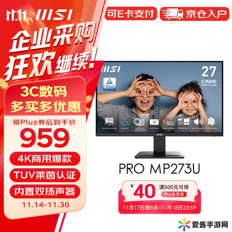 京东微星 27 英寸 4K 显示器 内置双扬声器 TUV 莱茵认证 PRO MP273U 黑色 939 元直达链接