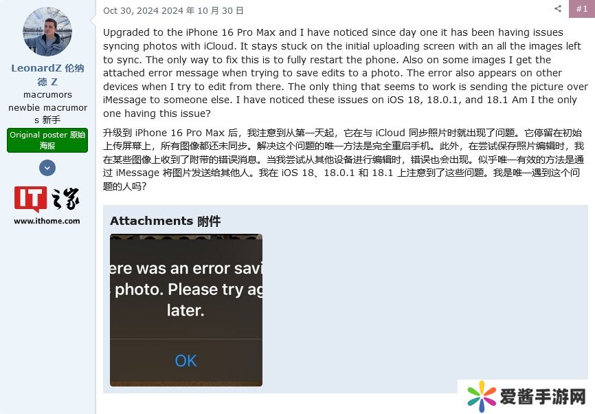本站 11 月 19 日消息,科技媒体 MacRumors 昨日(11 月 18 日)发布博文,报道称在其论坛、Reddit 社区、X 社交媒体平台上,有不少 iPhone 用户反馈升级至 iOS 18 后,照片(Photo)应用无法保存编辑后的照片。