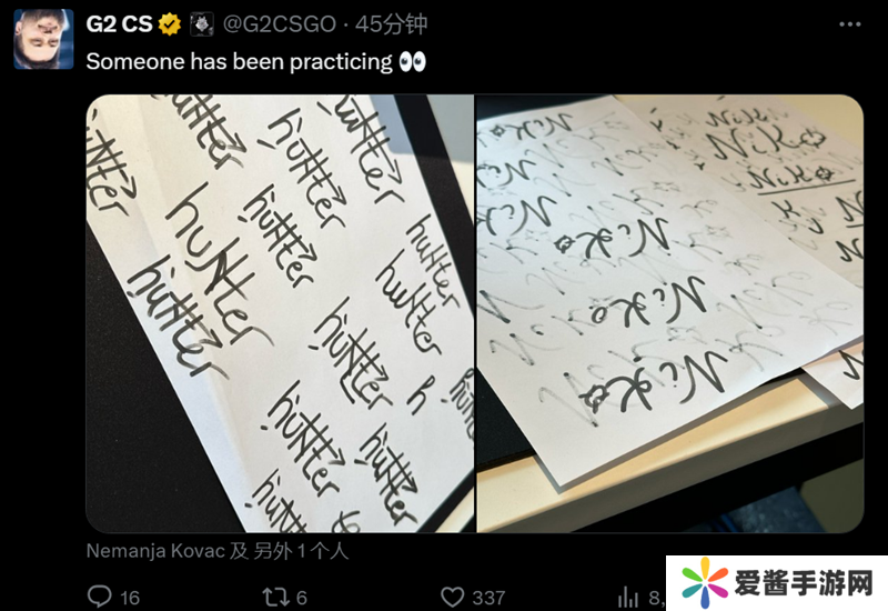 而G2官方也分享了波黑兄弟NiKo和huNter-两人练习签名的草稿纸。鉴于本次Major,V社要求选手在5-10秒内完成签名设计,因此职业哥们都在提前打磨自己的签名。