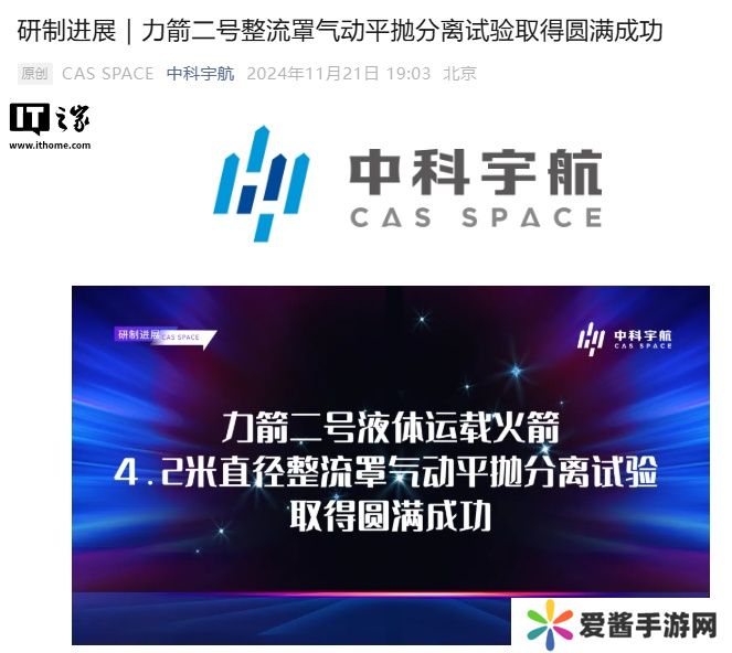 本站 11 月 22 日消息,中科宇航宣布,近日,力箭二号液体运载火箭 4.2 米直径整流罩气动平抛分离试验取得**成功,是国内首次大型整流罩地面常压状态平抛分离试验。此次试验对整流罩平抛分离系统设计方案的正确性、分离时序设计的正确性、各系统工作协调匹配性等进行了充分考核。