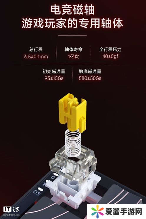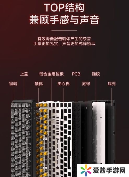 黑爵AK680 MAX 磁轴键盘全系采用 TOP 结构,使用铝合金定位板,配备磁稻轴 hifi 版(总行程 3.5±0.1mm、寿命约 1 亿次、全行程压力 40±5gf、初始磁通量 95±15Gs、触底磁通量 580±50Gs)。
