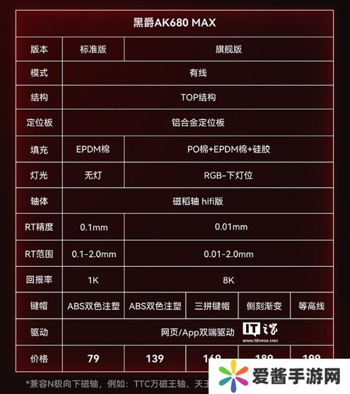 据介绍,黑爵AK680 MAX 磁轴键盘拥有标准版和旗舰版两款,均采用有线连接方式,延迟约 0.125ms。其中 AK680 MAX 标准版回报率为 1000Hz、Pro 版回报率为 8000Hz。