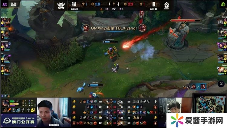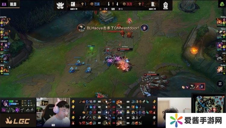 开场河道一级团宝蓝拉克丝Q闪留人,Smlz女警疯狂输出,宝蓝队打出1换3。前期Gogoing兰博TP下路让Uzi卡莎拿到双杀,Uzi队后续上路三人越掉Xiyang纳尔,宝蓝队不断推塔运营将经济优势保持在3k。