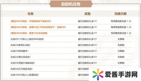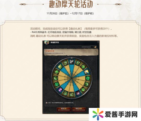 在11月26日维护后至12月17日维护前,英雄们完成Raid、特殊副本、红月地区战役、尼福尔海姆、骑士团、时空扭曲战役,就可获得趣动礼券(每周最多可获得20个),消耗礼券就能转动摩天轮获得奖励啦!奖励包含注入力量的新埃拉材料等可用于提升装备的道具哦!