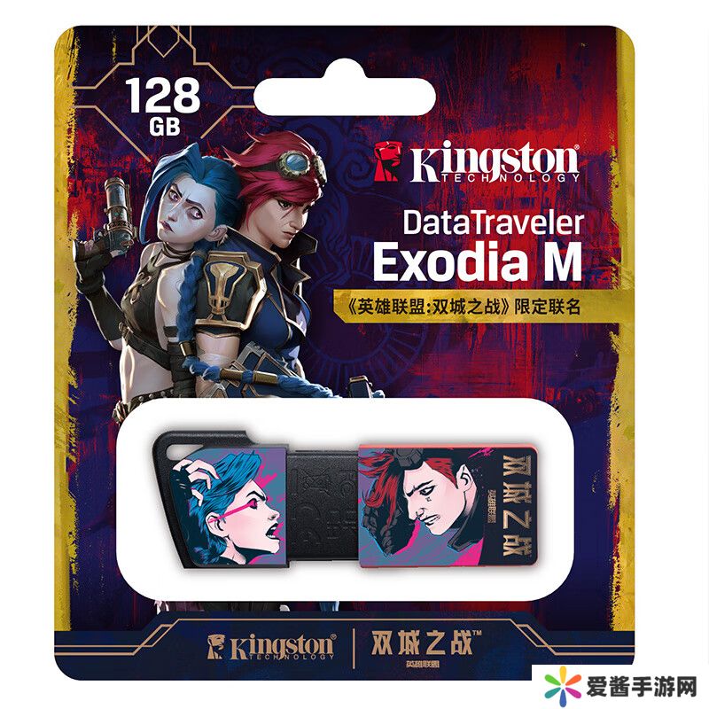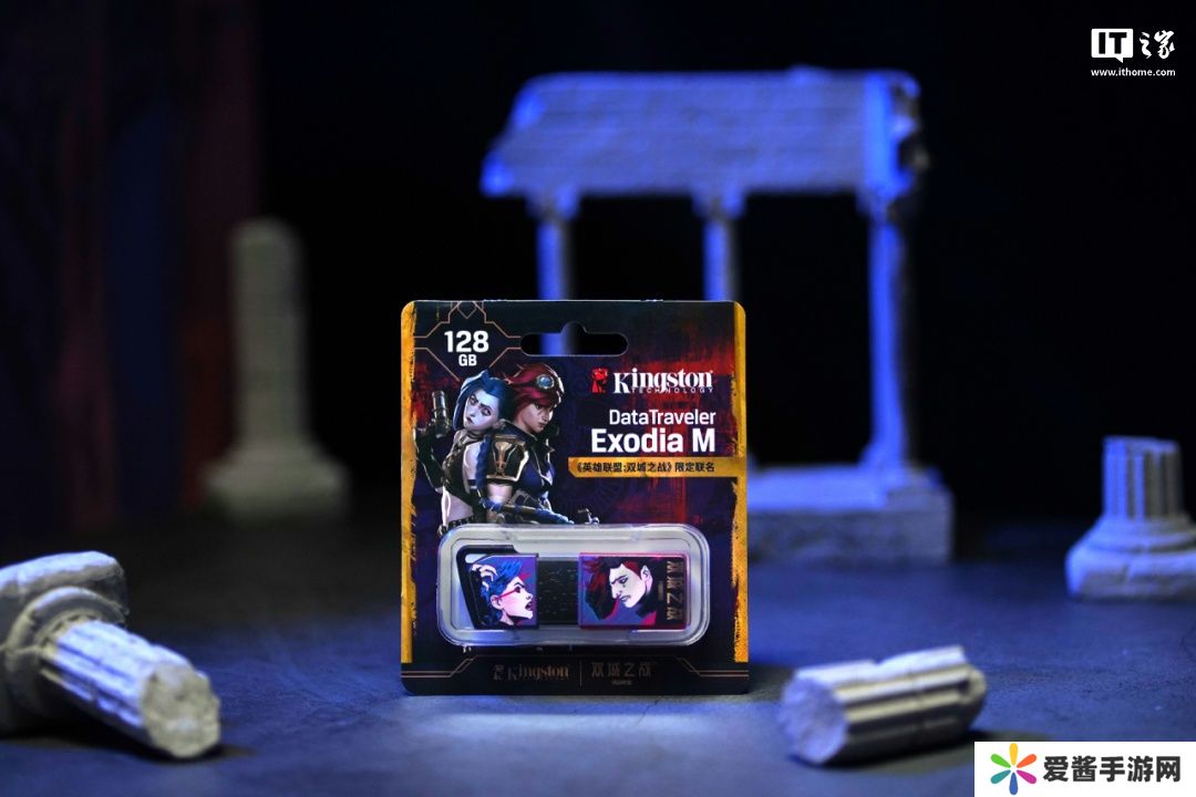 内含 128GB 的金士顿 DataTraveler Exodia M 闪存盘,与众不同的是在外壳上印有金克丝和蔚这一对姐妹头像。