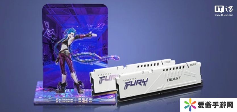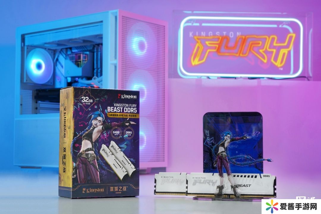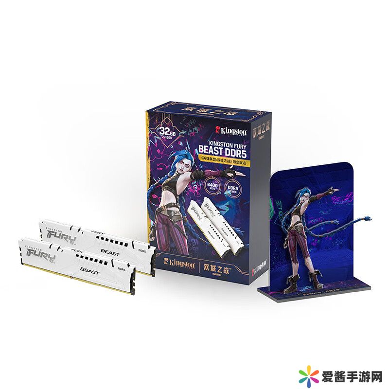 内含 2 条 16GB 的 Kingston FURY 超级野兽(Beast)DDR5 6400MT/s 内存 组成的套装,以及金克丝人形立牌。