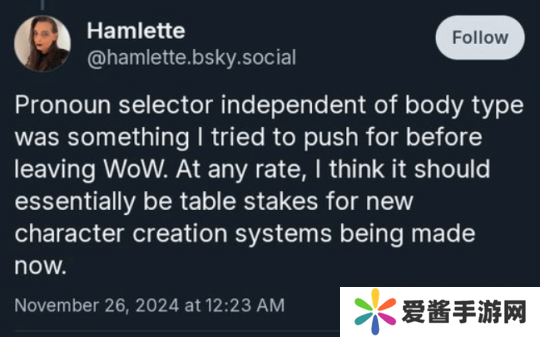 更令人没想到的是,这件事还炸出了一些潜水的隐藏大鱼。一位前暴雪员工在X上支持起了黑曜石的做法,为此她还表示:“独立于身体类型的性别代词选择是我在离开《魔兽世界》之前尝试推动的东西。无论如何,我认为这应该成为现在角色创建系统的必备元素。”