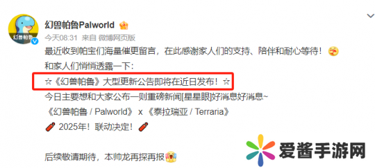 就在今日,《幻兽帕鲁》正式确认将联动《泰拉瑞亚》,具体联动活动预计会在2025年推出。这则公告的发布,也令无数玩家感慨万分。毕竟过去的几个月,《幻兽帕鲁》已经遇冷很久了。