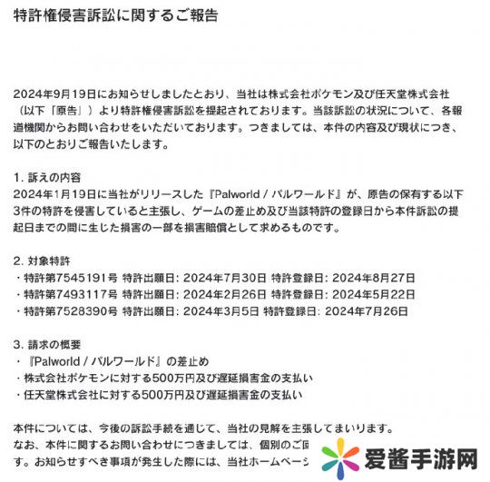 今年9月,任天堂联合宝可梦公司以专利侵权为由,对《幻兽帕鲁》开发商Pocket Pair提起了诉讼,要求禁止该游戏继续运营,并索赔自相关专利登记日起至诉讼提起日期间产生的部分损失、支付给任天堂和宝可梦公司各500万日元。