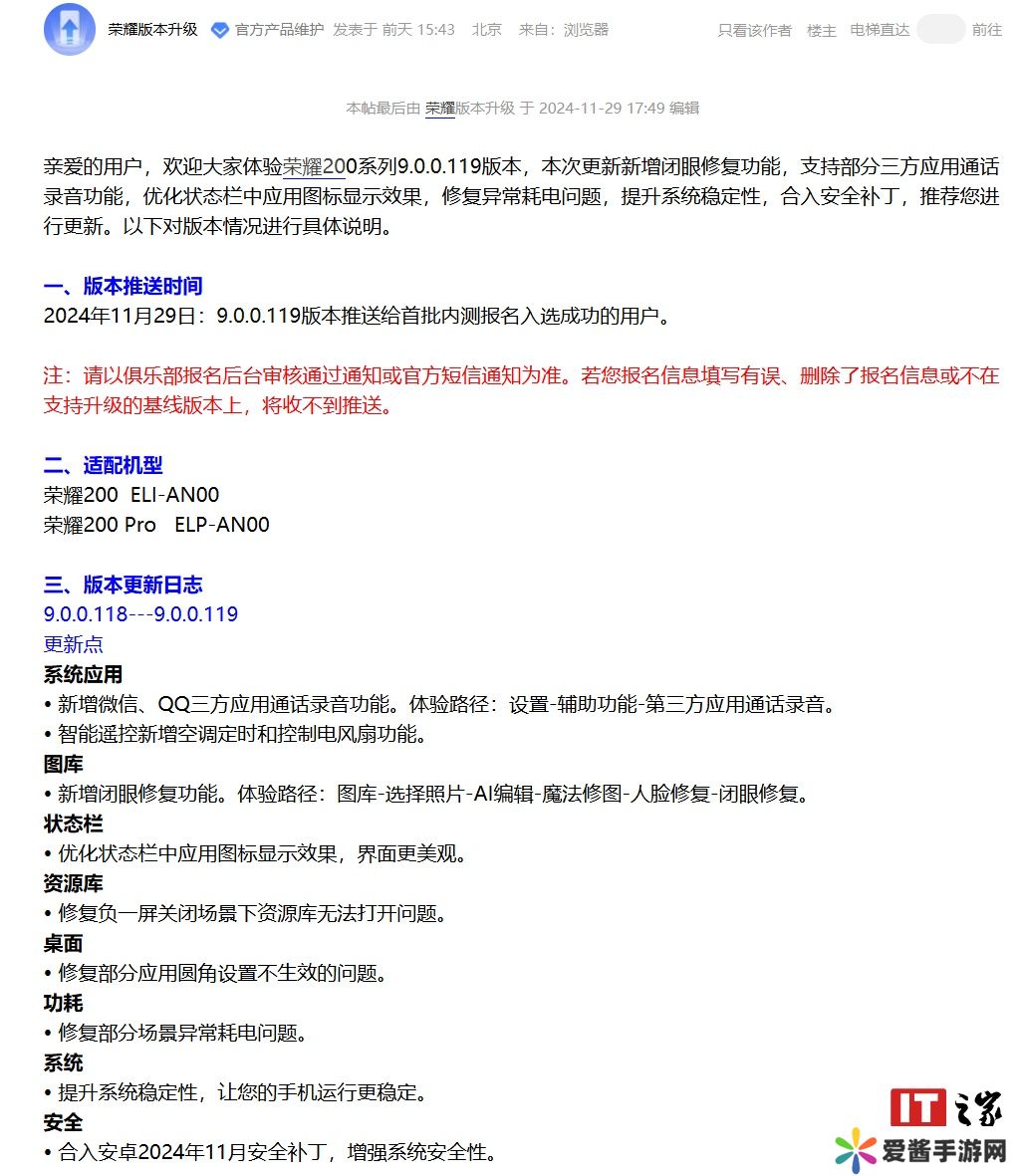 此外,荣耀 200 系列手机也同步获推 MagicOS9.0.0.119 版本升级,更新内容与 Magic 4 / Vs2 手机一致,新增三方应用通话录音、闭眼修复等功能。