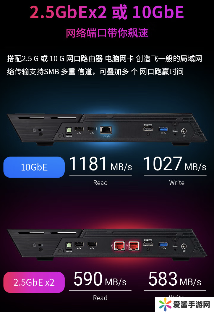 系列NAS尺寸为308.26 x 193 x 48.3mm,配备4GB RAM,最高能扩展 12 块 M.2 SSD(PCIe 4.0+3.0),支持4K 10-bit硬件解码和HDMI 2.0b输出,底部内置80mm风扇散热。