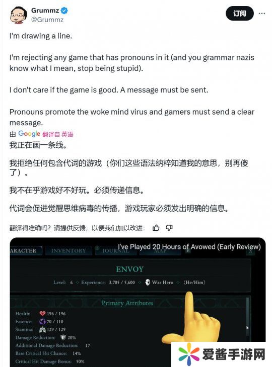 X上致力于反woke的推主也转发了《宣誓》加入代词的消息,并呼吁玩家拒绝/抵制一切含有代词的游戏,不管这个游戏好不好玩。