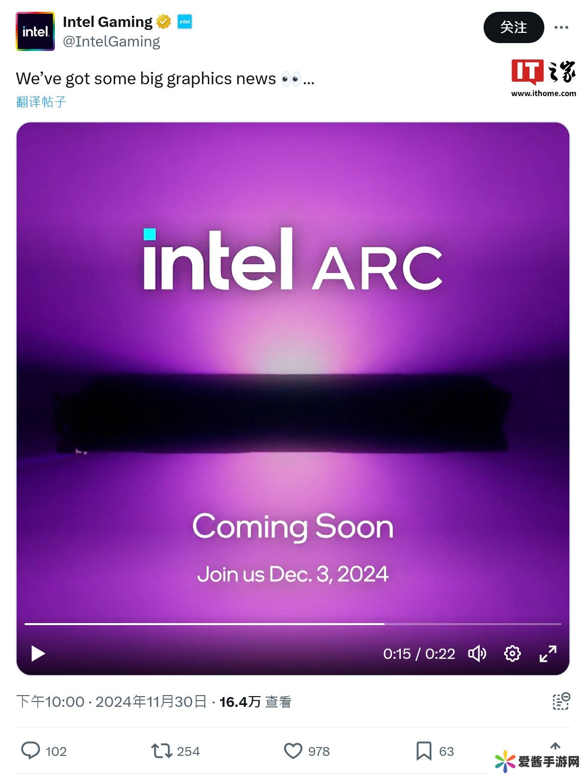 本站 12 月 2 日消息,英特尔官方 X 平台账户 Intel Gaming“英特尔游戏”北京时间 11 月 30 日发布动态,预告将于当地时间 12 月 3 日公布一些“显卡大消息”。从目前的情况来看英特尔届时将发布锐炫 B 系列 "Battlemage" 独立显卡。