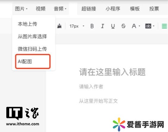 本站 12 月 2 日消息,微信公众号后台最近推出了一项全新功能,在文章编辑过程中,除了传统的从图片库选择和本地上传图片外,新增了一个选项 ——“AI 配图”。