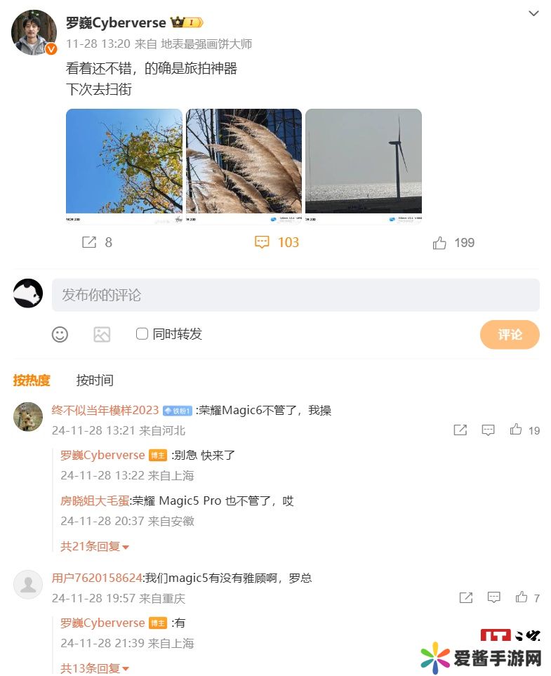 曾出任华为 Fellow Cyberverse 总工程师、相机总工程师的罗巍在 11 月 28 日分享了水印为“HONOR 200”的手机所拍摄的照片,并配文“看着还不错,的确是旅拍神器,下次去扫街”,预计在为数字系列新机预热(此前有消息称罗巍已加入荣耀影像团队)。