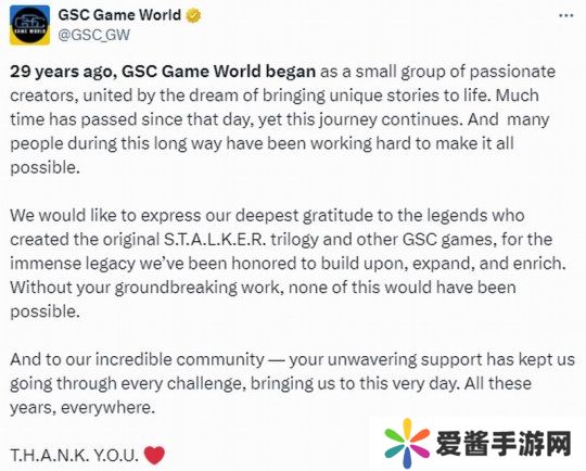 官方表示29年前,一群充满激情的人创建了GSC Game World,因为要将独特故事变为现实的梦想而团结在一起。如今时间已过去很久,这段旅程却仍在继续。官方称那些传奇开发者为《潜行者》系列奠定了深厚基础,留下宝贵财富,让他们在此基础上继续发展、扩大和丰富,让《潜行者2》成为现实。