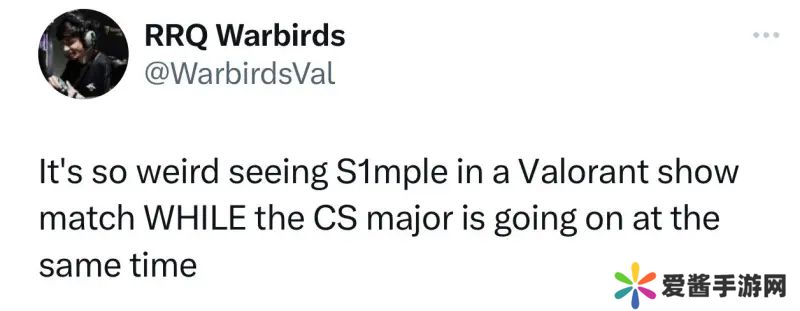 VCT 太平洋联赛RRQ战队的主教练Warbirds发文:CS major大赛在打的同时,s1mple却在参加无畏契约的活动,这感觉太奇怪了。