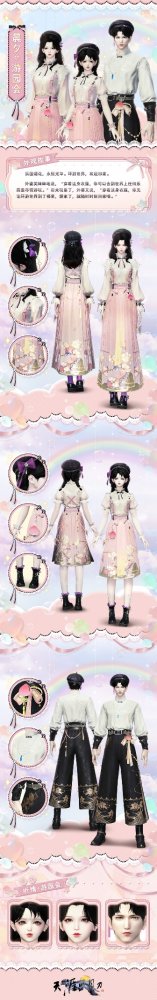 女款马面裙采用梦幻的桃粉色,裙摆花朵绽放,与同色上衣相互呼应,肩膀蕾丝花边,更添优雅与温柔;男款上白下黑经典配色,头戴贝雷帽更显帅气十足!