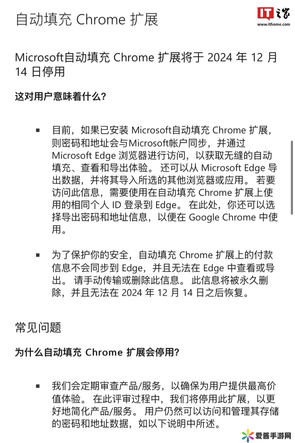 本站 11 月 16 日消息,微软宣布旗下“Microsoft自动填充Chrome扩展”插件将于2024年12月14日停用,该插件主要用于同步用户保存在微软账号上的账号密码、地址信息。