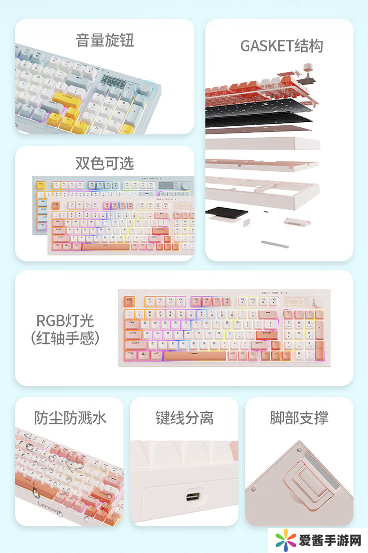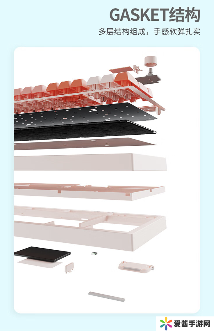 规格方面,这款键盘采用 Gasket结构,号称可以提供类似红轴的机械手感,采用纳米级高分子静音材料,大幅度减少按键碰撞发出的声音。