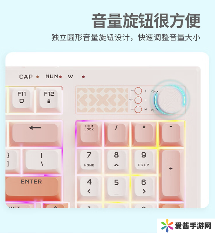 外观方面,这款键盘目前暂仅可购买粉色配色款,其采用了95键布局、自带音量旋钮,支持RGB灯效、防尘防溅水、键线分离、配有人体工学脚撑。