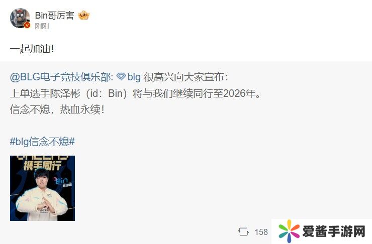 直播吧12月5日讯 今日BLG官方官宣与Bin选手续约,Bin转发续约公告,并配文:一起加油!