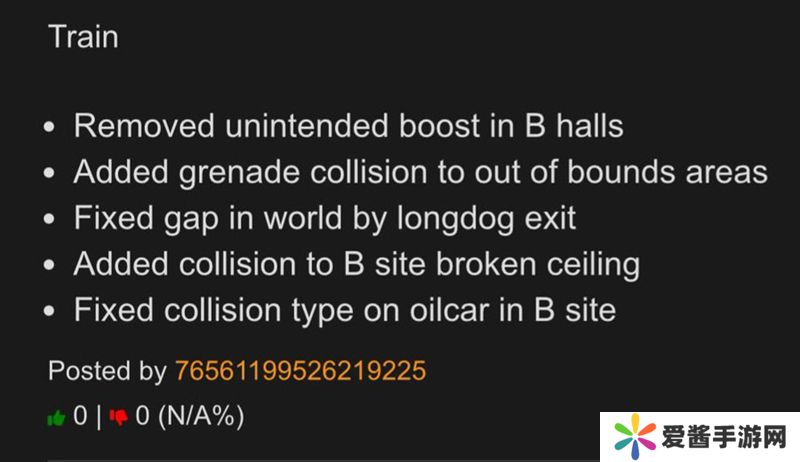 今天早上开发人员推送了一波小更新,本次更新以Train地图的修复与调整为全部内容。具体更新内容如下: