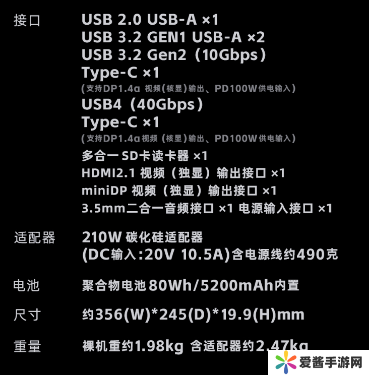 该机整体采用深灰配色,采用了ACD三面铝合金、镁合金框架,重约1.98kg,厚18mm,屏幕支持180度开合,配备80Wh电池。