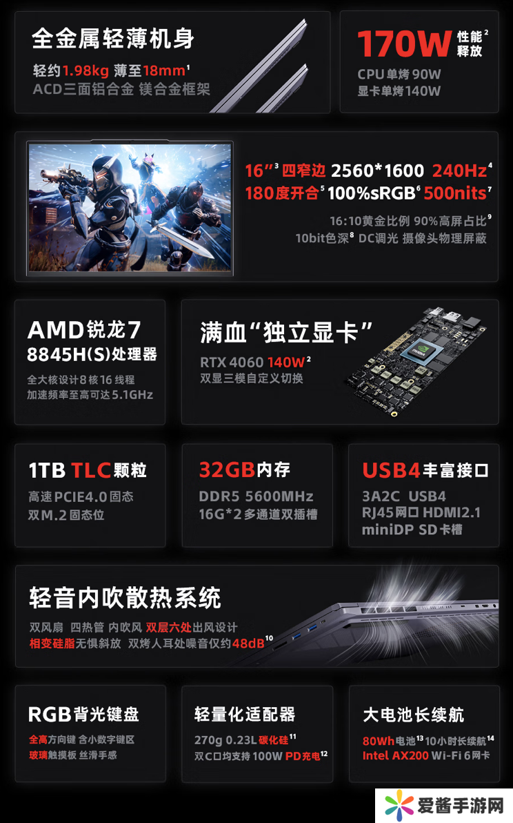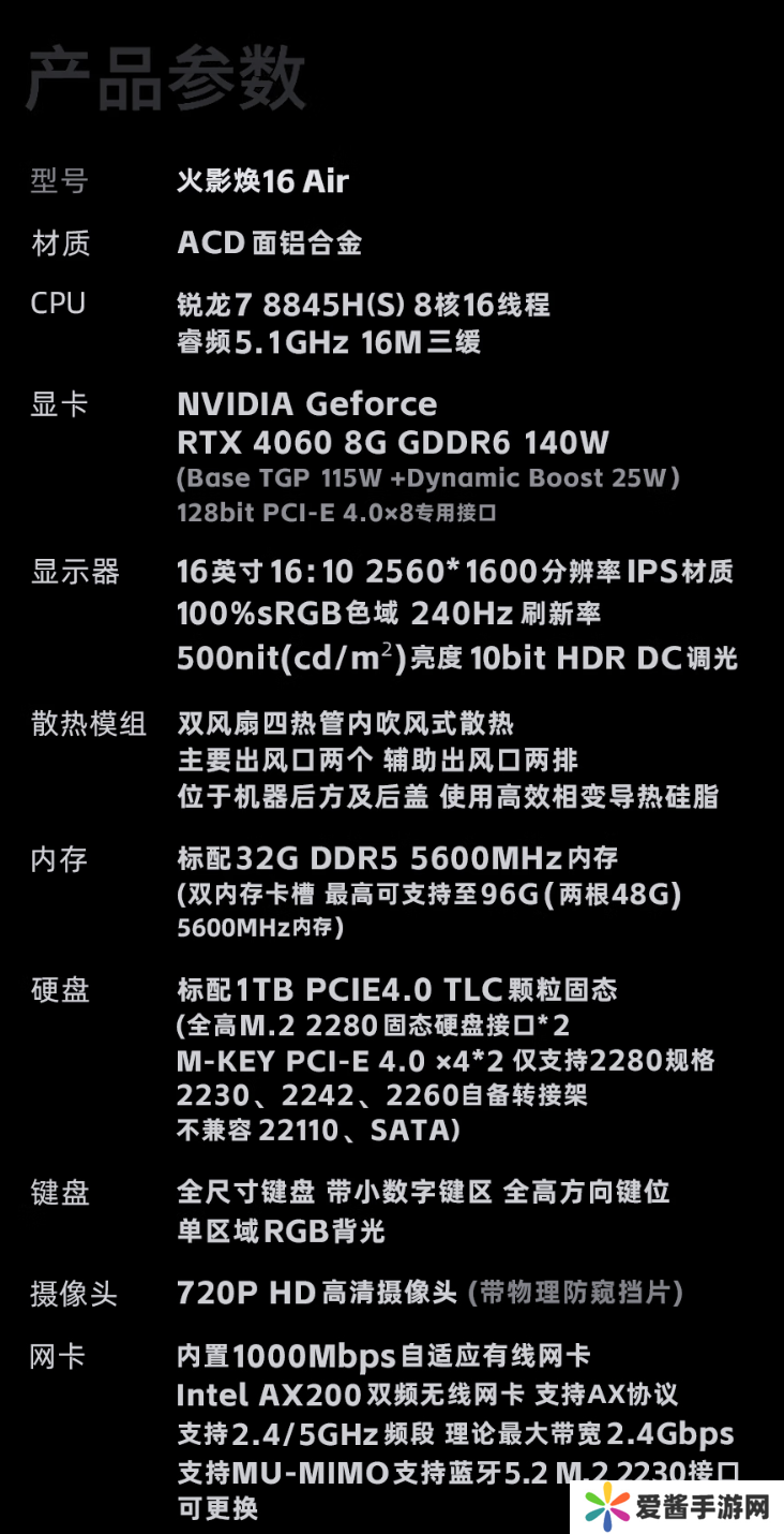 该机搭载8核心16线程AMD锐龙7 8845HS处理器,配备 32GB 5600MHz RAM,内置1TB TLC颗粒PCIe 4.0 SSD,使用 160W RTX4060显卡,配备双风扇四热管散热。