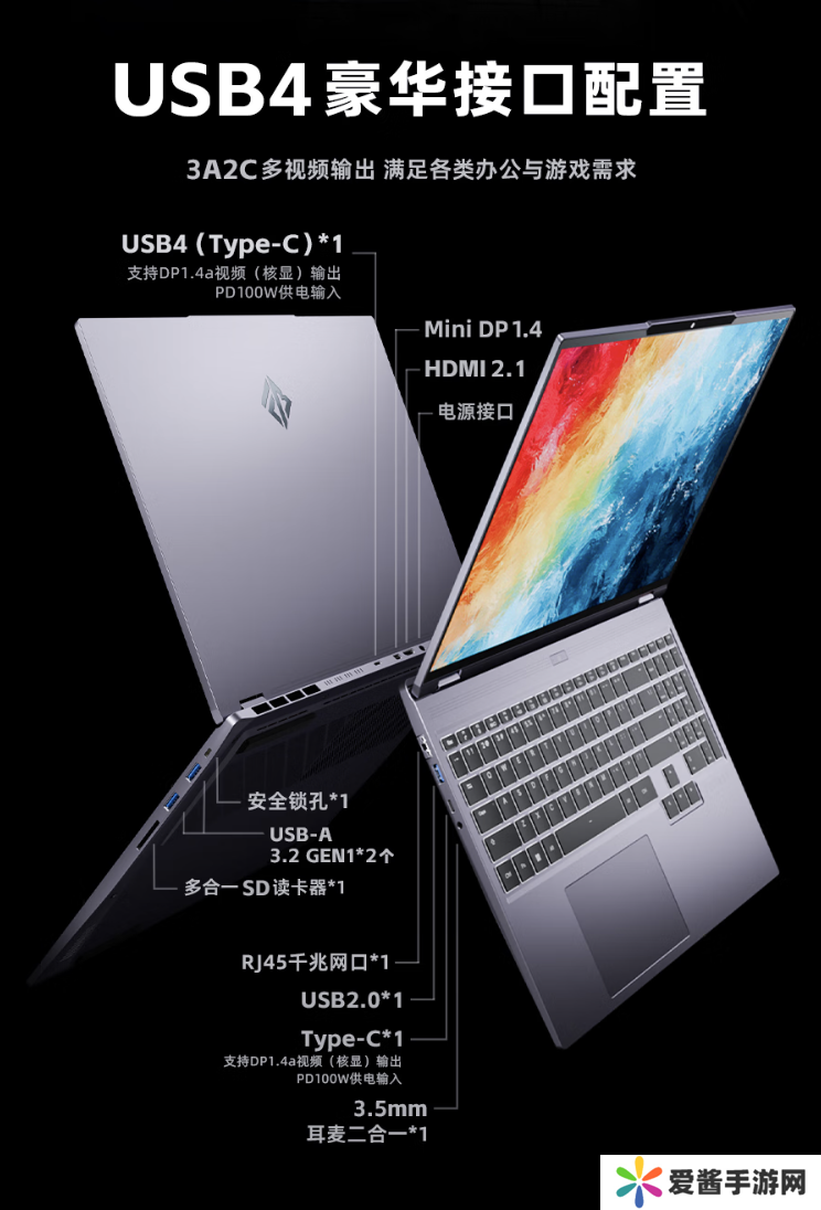 接口方面,该机左侧配备1个RJ45网口、1个 USB-A 2.0接口、1个 USB-C 100W接口、1个3.5mm音频接口;右侧配备2个USB-A 3.2 Gen 1接口、1个SD卡接口;后侧配备1个USB4接口、1个 Mini DP接口、1个HDMI 2.1接口。