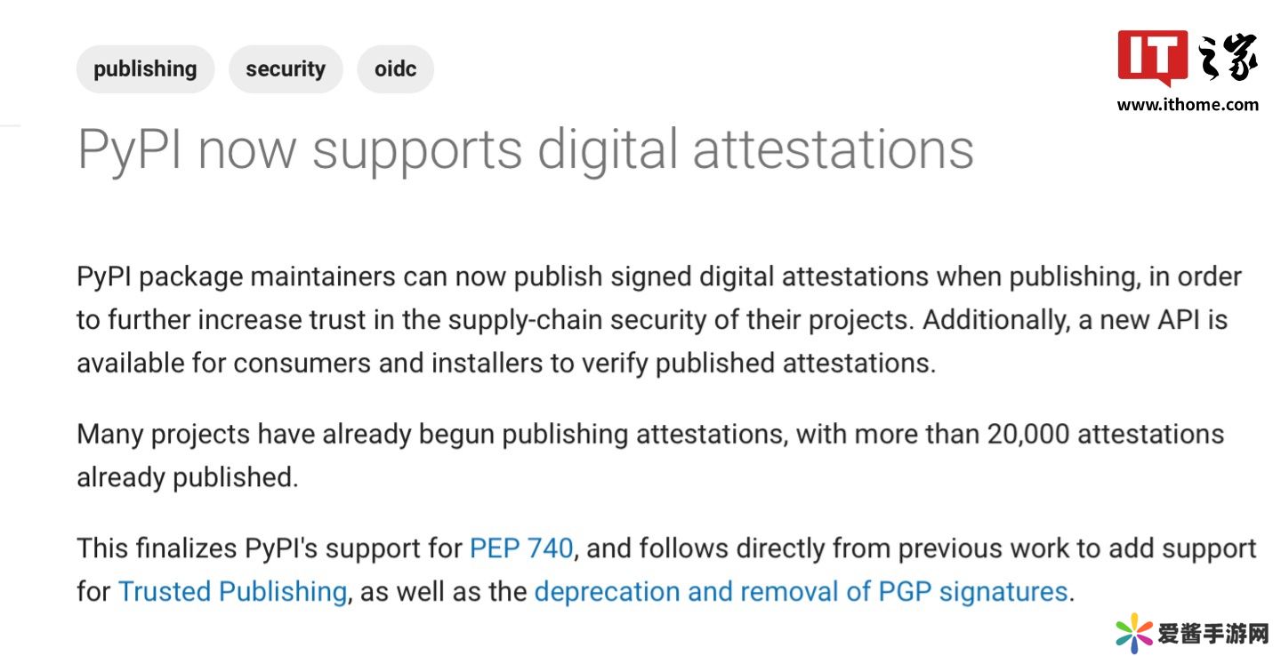 本站 11 月 16 日消息,Python软件包存储库PyPI现已上线数字认证(Digital Attestations)功能,这项功能允许软件包维护者在发布包时附加经过身份验证的数字签章,以便于验明正身。