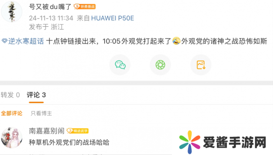 以至于新一期大宋种草机刚刚开启,逆水寒外观党就集体暴动了,祭出的拉票手段五花八门,脑洞大开,只为了能第一时间抓住路过玩家的注意力,让自己心目中的最美外观成功C位出道。一时间,一场百万人参与的热血大战就这么席卷了全江湖,随手一刷微博超话、贴吧、公告留言区,都是玩家热议的相关话题。