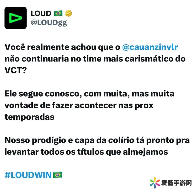 LOUD战队宣布Cauanzin将留队,继续征战2025赛季。战队表示他将带着强烈的意志迎接未来的挑战,目标是为团队争夺更多冠军头衔。原文如下: